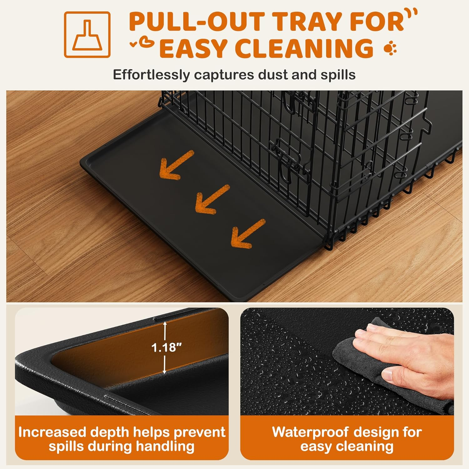 - Pull-Out Leak-Proof Tray: This pet crate includes a pull-out leak-proof tray at the bottom to catch spills and accidents. The tray can be easily removed for cleaning, making maintaining a snap. The locking buckles keep the tray securely in place